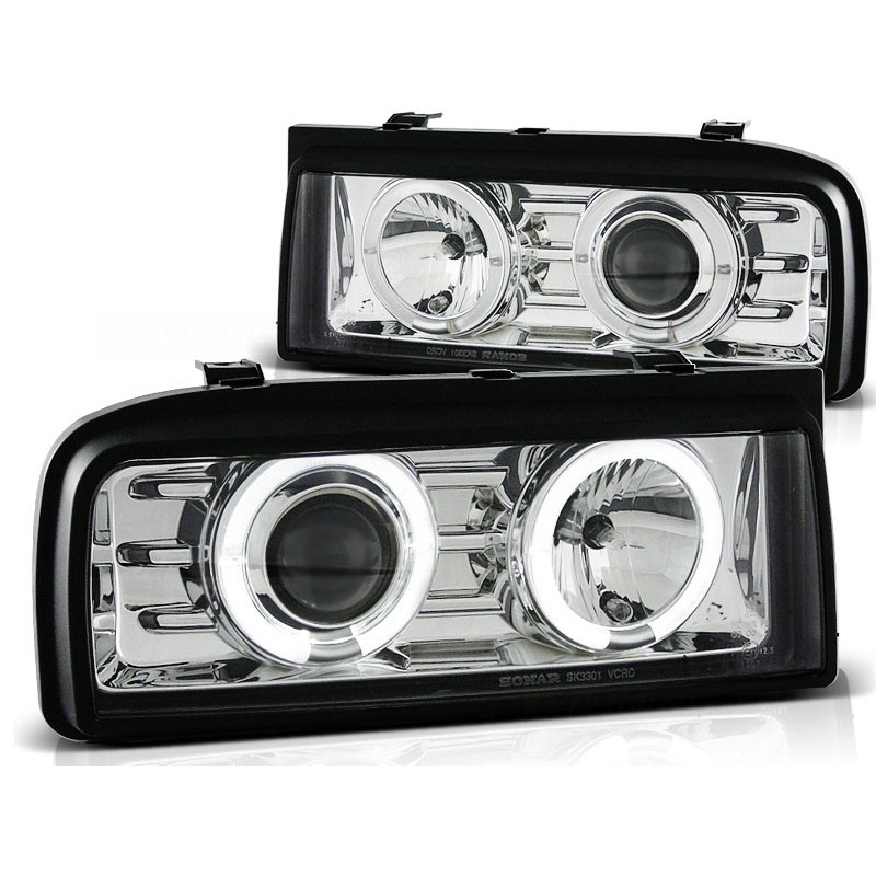 Phare avant . Produit neuf, livré par paire (gauche droite). marquage E pour homologation . Feu de stationnement : feu de croisement : H1 inclus Faisceau de route : H1 inclus Réglage : manuel (un dispositif de réglage électronique ne peut être installé). ANGEL EYES