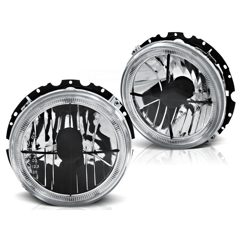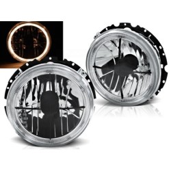 Phares extérieurs avant avec . Produit neuf, livré par paire (gauche droite). marquage E pour homologation . Feu de stationnement : faisceau inférieur et faisceau de route: H4non compris Réglage : manuel (un dispositif de réglage électronique ne peut être installé). ANGEL EYES