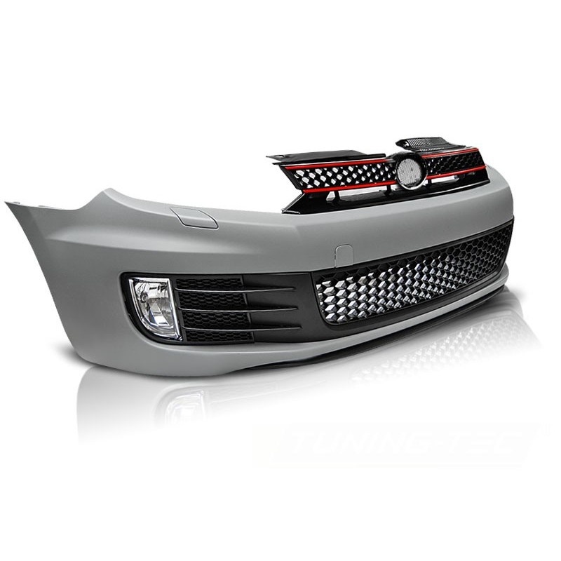 Pare-choc avant GTI STYLE . Matiere polypropylène . L'ensemble comprend: - Emplacement lave phare - Cache lave phare - Cache crochet de remorquage- calandre inférieure - Cache phare antibrouillard - fog lamps- Pare-choc avant lip- mesh grille with red frame- slides