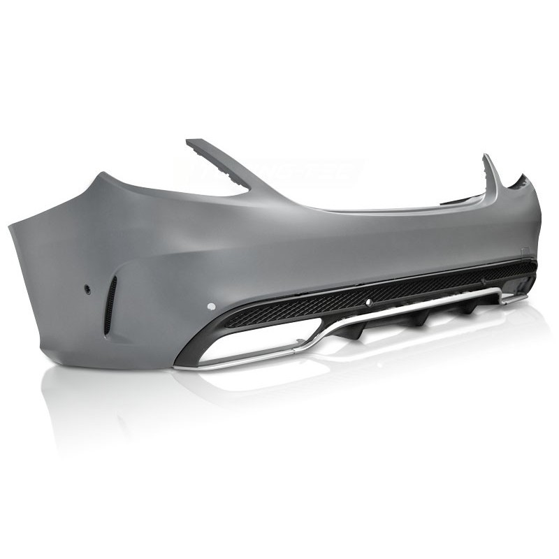 Pare-chocs arrière C63 STYLE Avec emplacement capteur de stationnement . Matiere polypropylène . L'ensemble comprend: - PDC avec trou capteur- Cache crochet de remorquage- diffuser withtwin outlettwin muffler- ARGENT strips- side cover- reinforcement- All components needed to install/ mount a bumper PDC